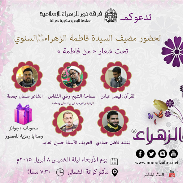 كرانة - فرقة نور الزهراء عليها السلام الإسلامية تنظم فرقة نور الزهراء الإسلامية يوم 8 أبريل 2015م مضيف السيدة فاطمة الزهراء عليها السل ...